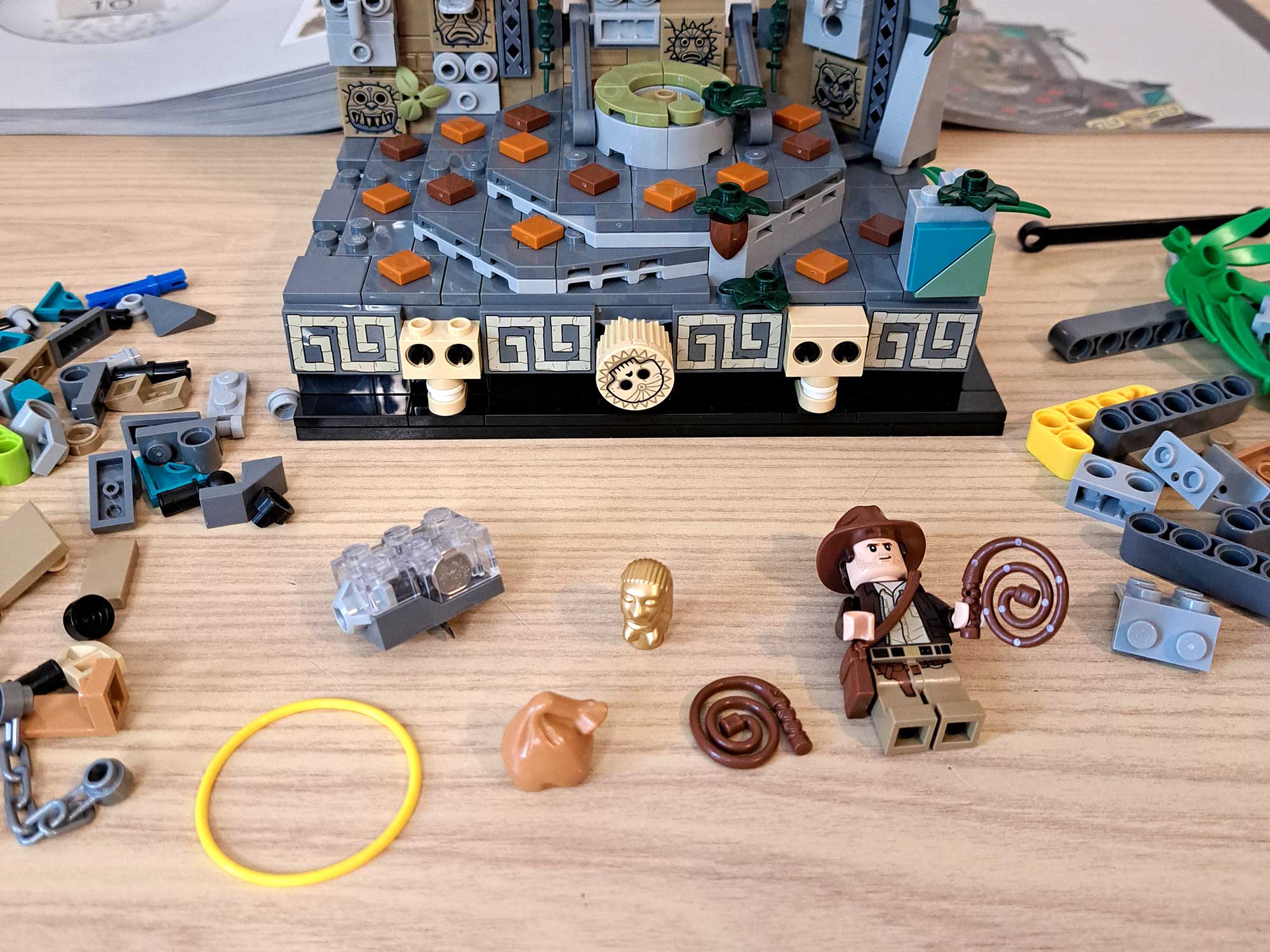 Con l’ultima busta troviamo, oltre ai pezzi per completare il tempio, la minifigure di Indiana Jones, 2 fruste, il sacchetto, la statuetta dell’Idolo d’oro (nuovo stampo), il mattoncino luminoso e un elastico che serve negli ingranaggi.