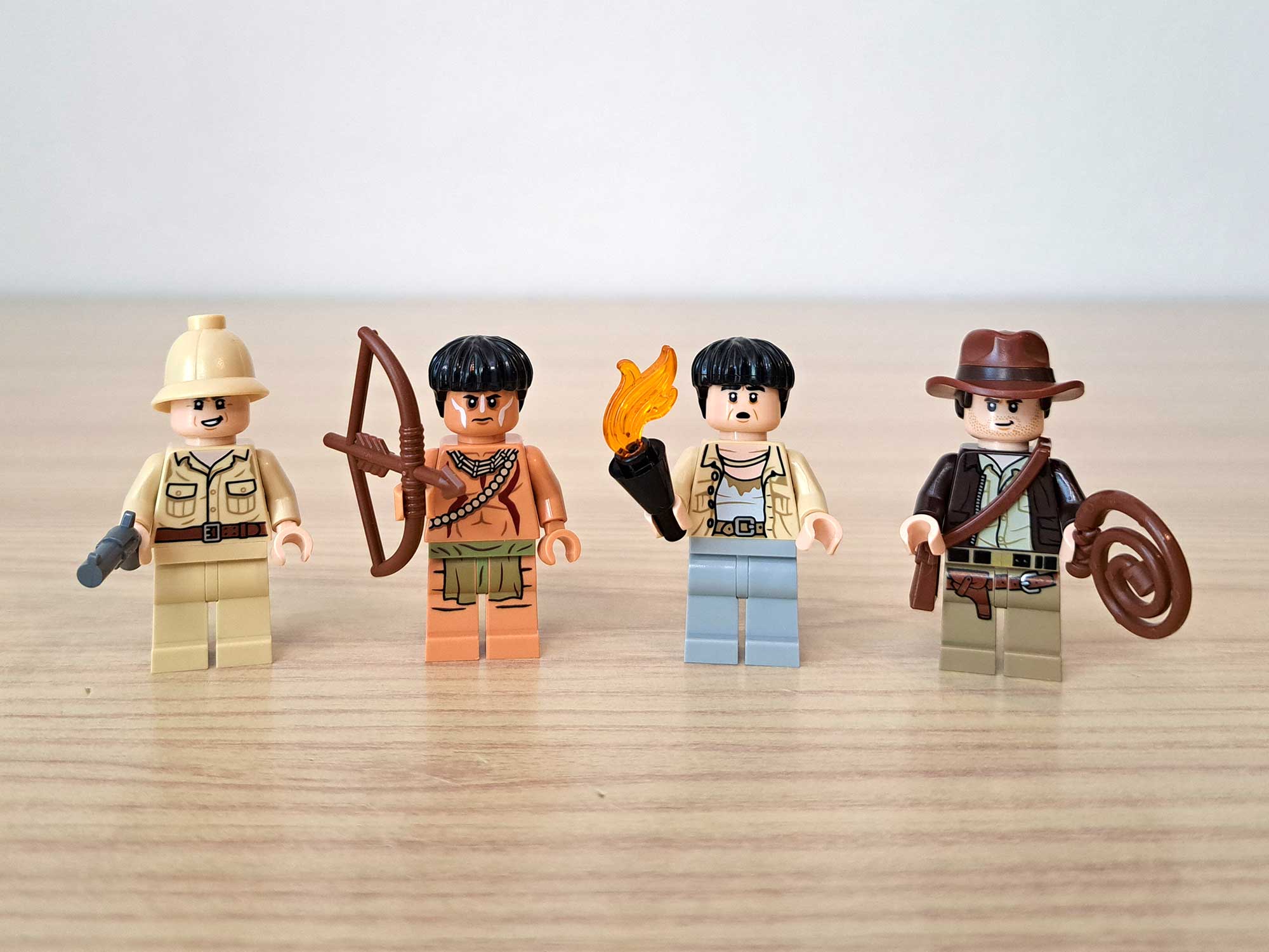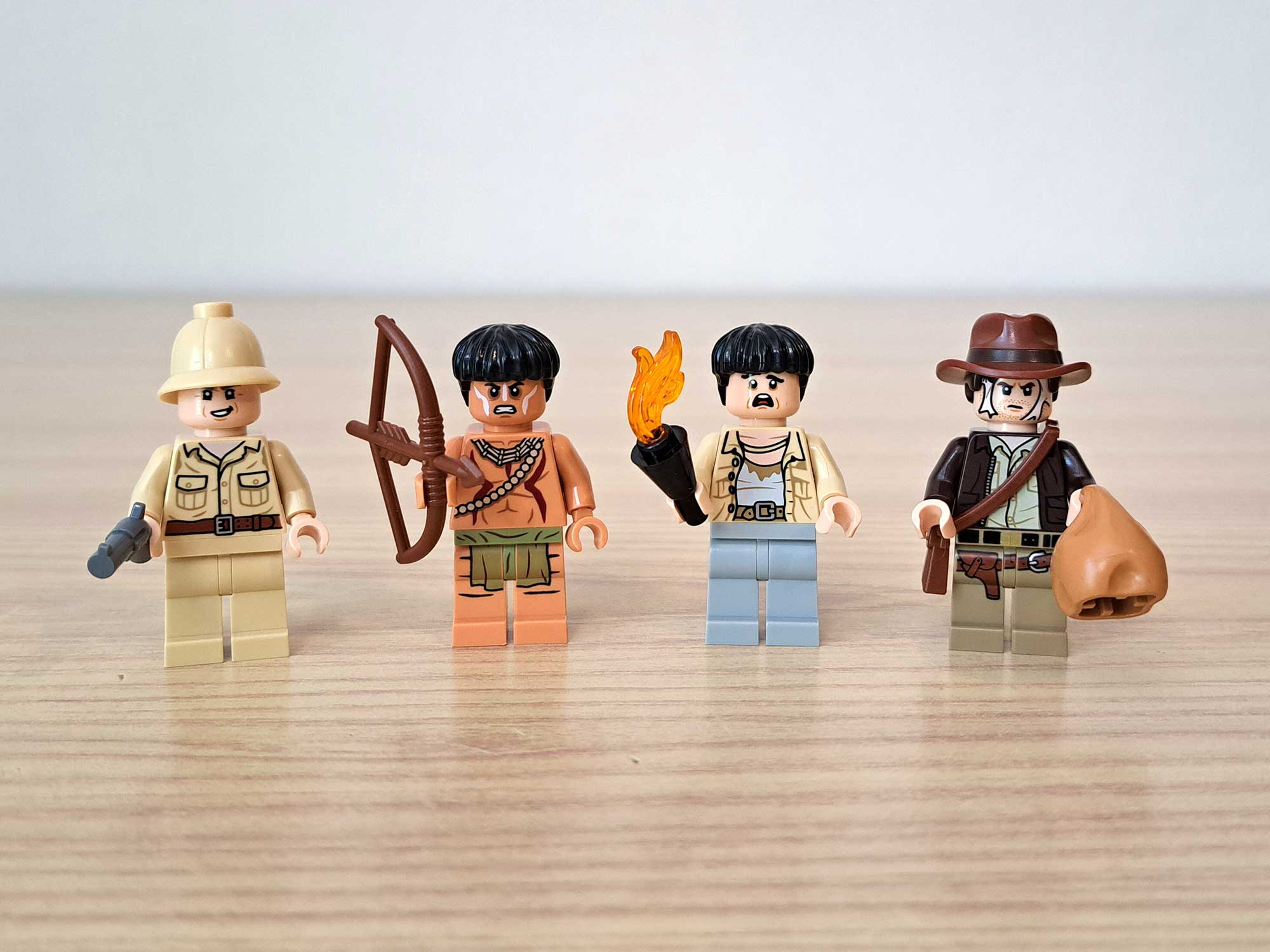Dando uno sguardo più attento alle minifigure vediamo che l’unico personaggio che ha una sola espressione del viso è Belloq. Quella del guerriero Hovitos, oltre a essere una novità, è particolare perché ha la carnagione tipica degli indigeni, mentre le altre ce l’hanno sul rosa chiaro che ormai viene usato sempre di più per le minifigure. Satipo ha una torcia in mano e sulle spalle dei ragni come nella scena del film. La seconda espressione di Indiana Jones ha le ragnatele sul viso mentre il cappello ha i capelli incorporati, a differenza delle precedenti versioni della minifigure; in effetti mettendogli solo il cappello la minifigure non sarebbe stata molto fedele all’icona del personaggio.
