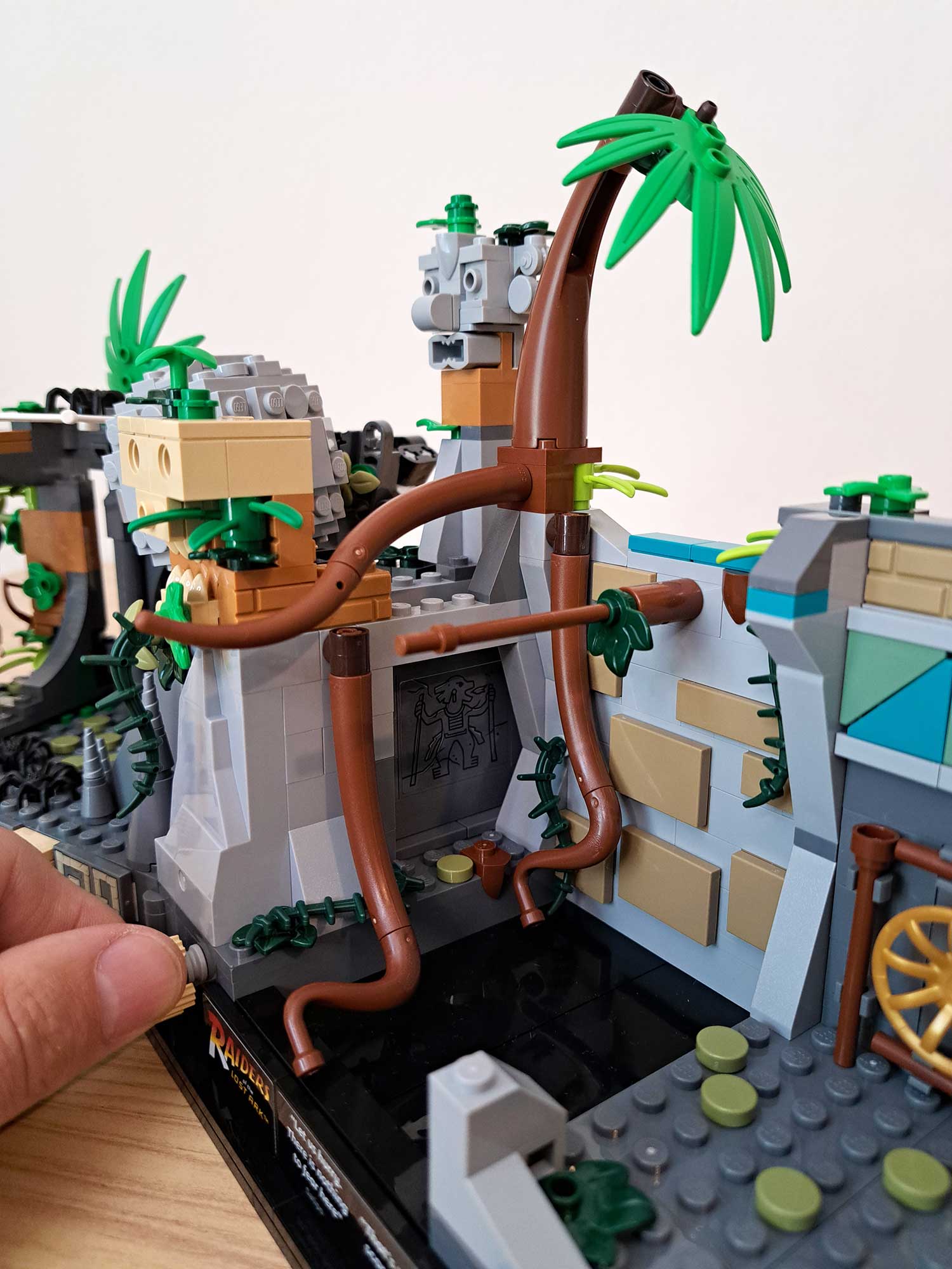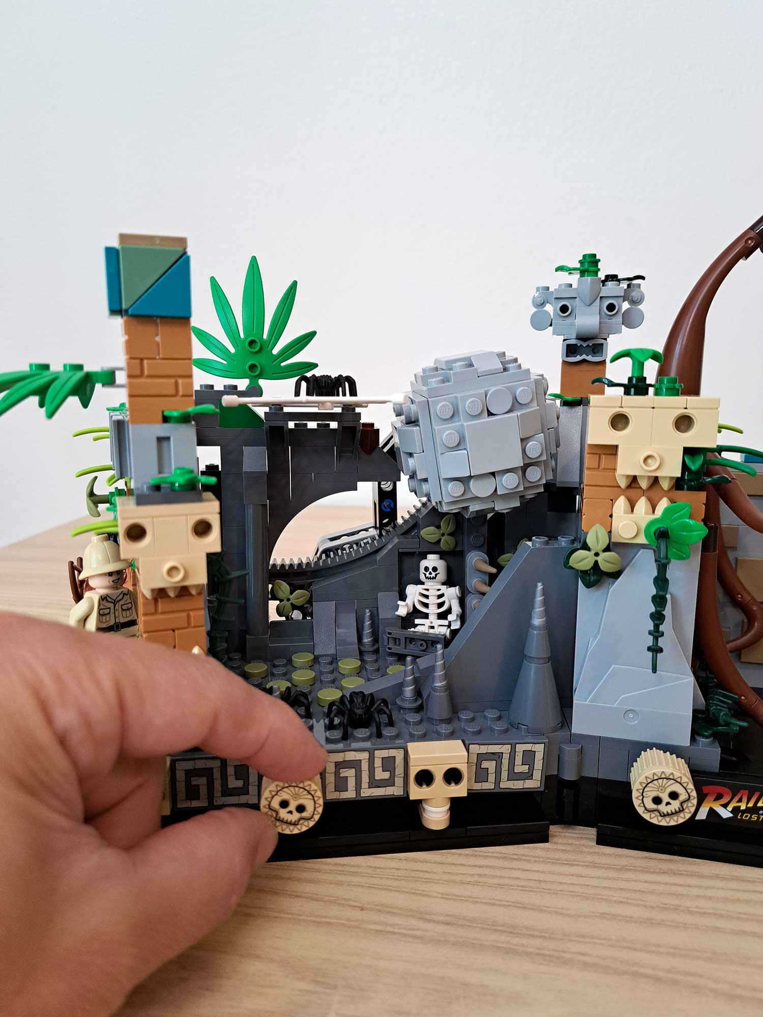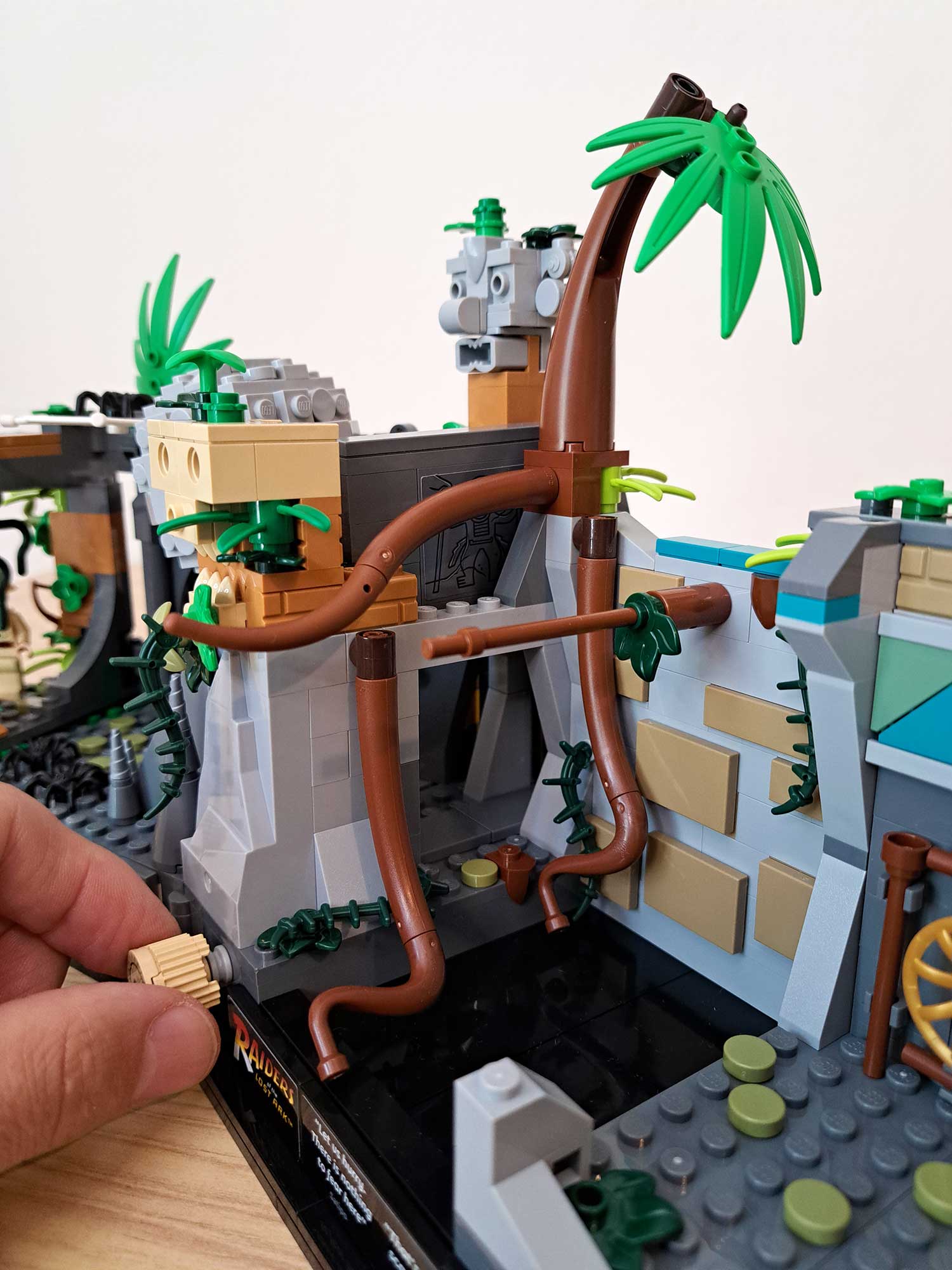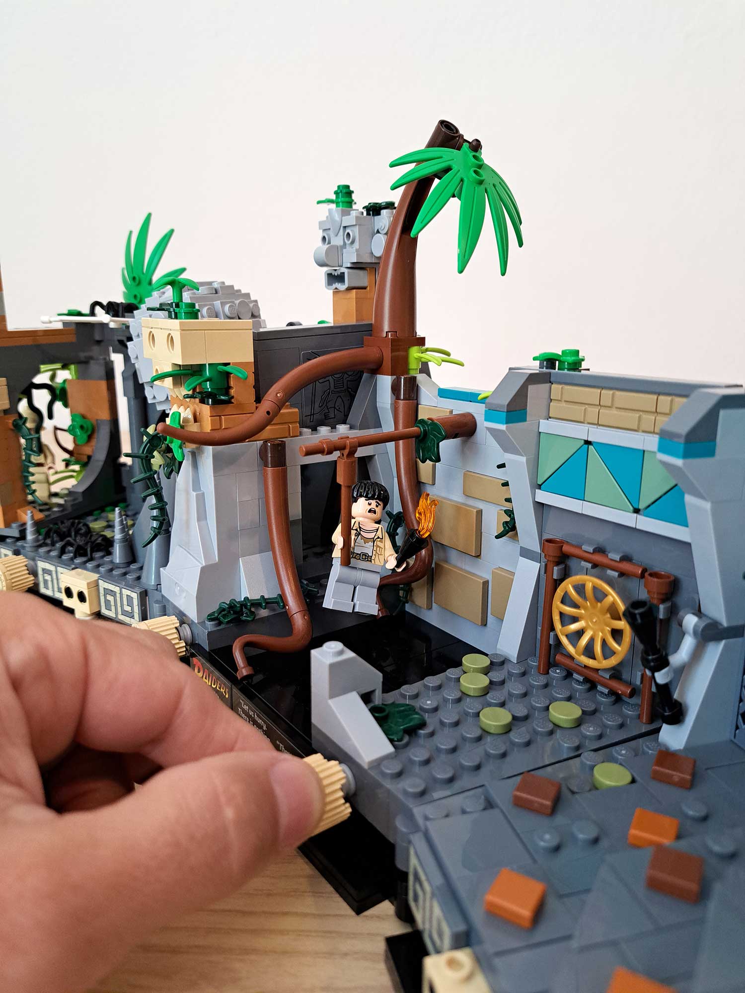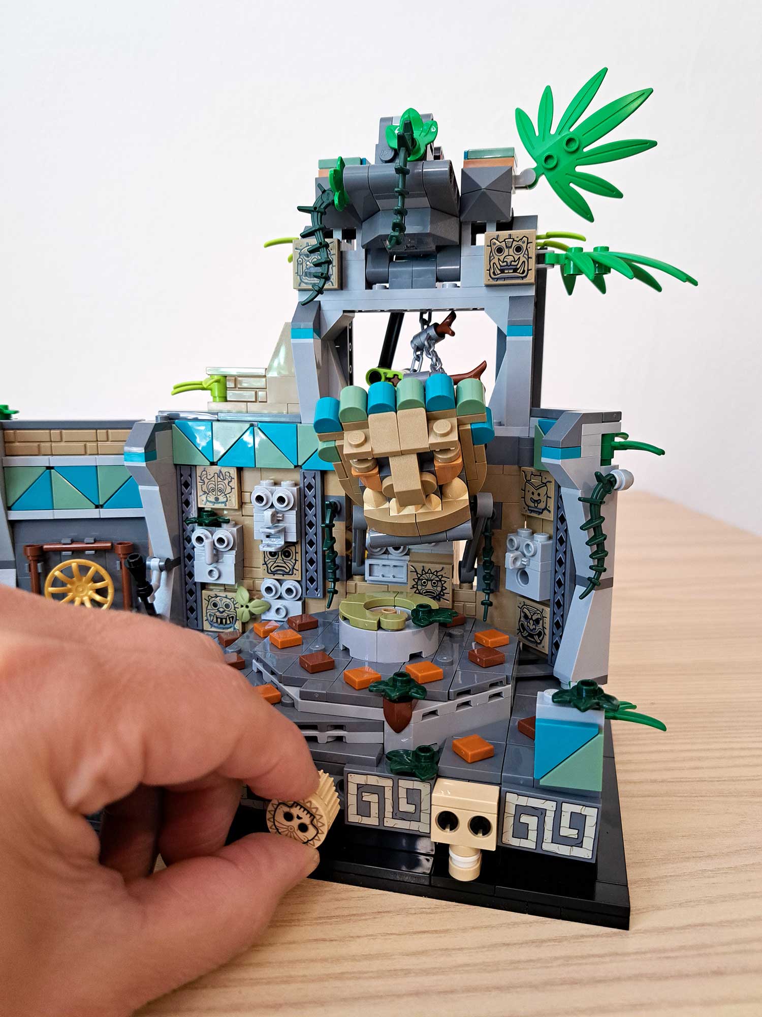 Arriviamo infine all’ultimo ambiente, dove c’è un altare rotondo con al centro la statuetta dell’Idolo d’oro e attorno la parete con le varie facce che abbiamo detto in precedenza. Qui alla base abbiamo una rotella con la quale, girandola, facciamo abbassare la pietra centrale con la statuetta, o il sacchetto se vogliamo seguire la scena del film, e allo stesso tempo accendiamo il mattoncino luminoso posto in alto. In più, facendo fare un altro scatto in avanti alla rotella vediamo spingersi in avanti e in basso il faccione più grande, simulando il crollo che avviene a seguito della sottrazione della statuetta. Il tutto è molto realistico ed è stato ben realizzato, gli ingranaggi sul retro sono a dir poco ingegnosi.