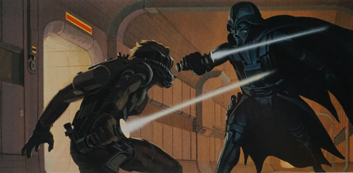 Creato dalla fantastica penna di Ralph McQuarrie - autore di tantissimi bozzetti legati a Star Wars™ - a seguito della richiesta di George Lucas di un personaggio "svolazzante, molto alto e scuro, come una sensazione spettrale che arriva nel vento", è stato quindi vestito dal costumista John Mollo.
