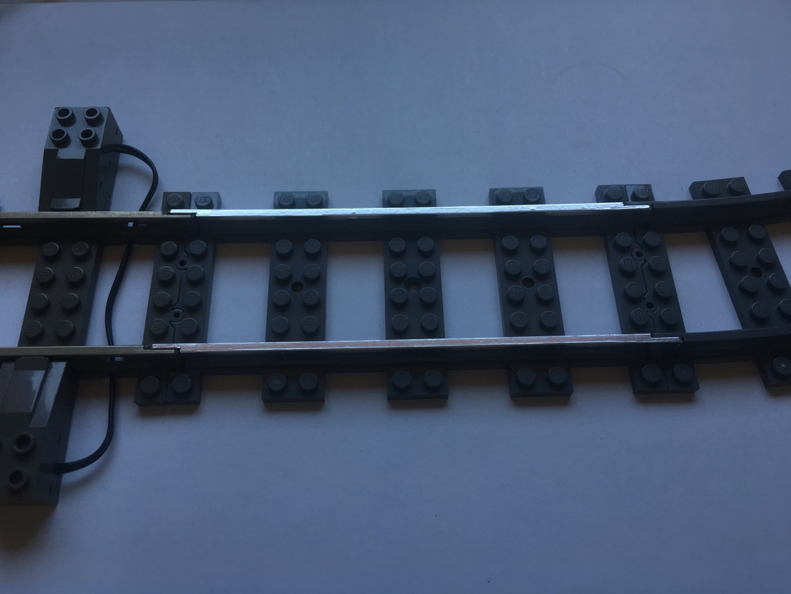 Nota 2: la maggior parte dei diorami che si osservano durante le varie esposizioni sono costruiti a moduli di una base (che sia essa 32x32 stud o 48x48 stud); visto che in questi casi anche i binari sono suddivisi in moduli, corrispondenti alla lunghezza delle basi e su di esse perennemente collegati, si consiglia di attaccare il nastro adesivo non sulla singola sezione di binario bensì su tutta la lunghezza della base in un blocco unico, così da semplificare e velocizzare il lavoro di copertura delle rotaie con il nastro d'alluminio, oltre a garantire con più certezza il passaggio di corrente per tutta la lunghezza della sezione di diorama.