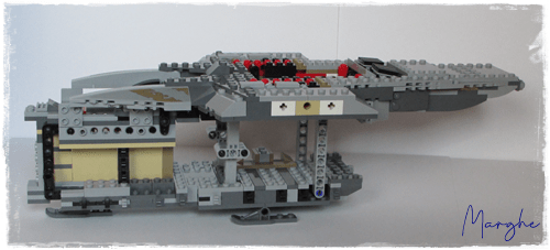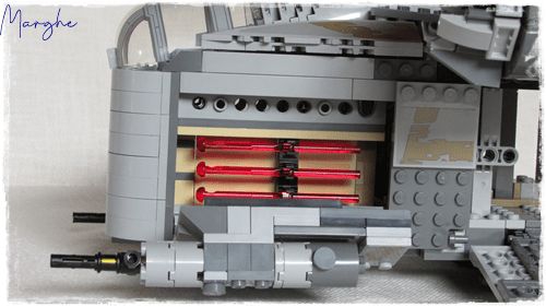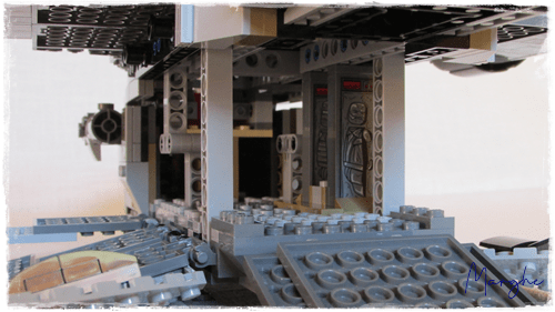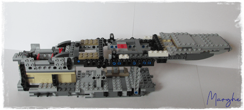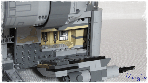 Il ponte inferiore è apribile da entrambi i lati, da una parte troviamo una cucccetta, dalla parte opposta l'alloggiamento per riporre i missili rossi. La stiva è decisamente spaziosa, anche se scarna di particolari, con la rampa laterale per la salita passeggeri e quella posteriore di carico; all'interno troviamo i 2 blocchi di carbonite, peccato che siano solo appoggiati senza alcun fermo, all'apertura della stiva normalmente cadono.