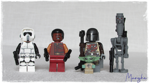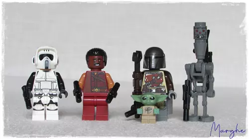 - Greef Karga, a capo della Gilda dei Cacciatori di Taglie di cui distribuisce le taglie, è una minifig disponibile solo in questo set. Ottima minifig accurata, con doppia stampa della testa per dare il giusto risalto al suo personaggio, è abbastanza fedele alla serie televisiva.