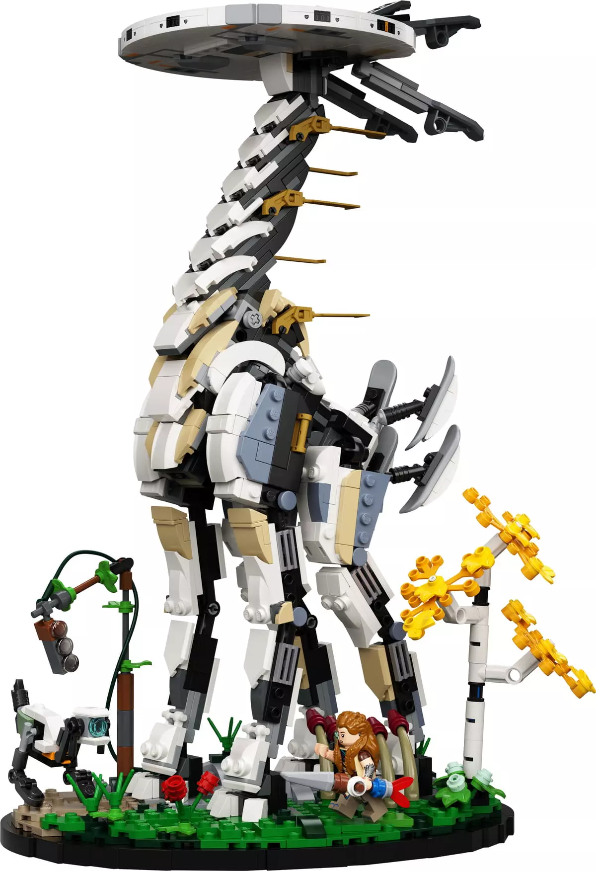 Per aggiungere caratteristiche sorprendenti all'interno del modello, sono inclusi un nuovissimo copricapo per Aloy, il suo arco e la lancia in muratura, un Osservatore con diverse opzioni di occhi, blu, gialli o rossi, e, infine, la macchina Collolungo, con la tipica testa liscia a forma di disco e le lunghe gambe sottili. E per rendere il set ancora più dettagliato, i fan possono completare la loro costruzione con i particolari del paesaggio originale, come l'albero di betulla in mattoncini, l'erba alta e un semaforo arrugginito, per un risultato finale stupefacente.
