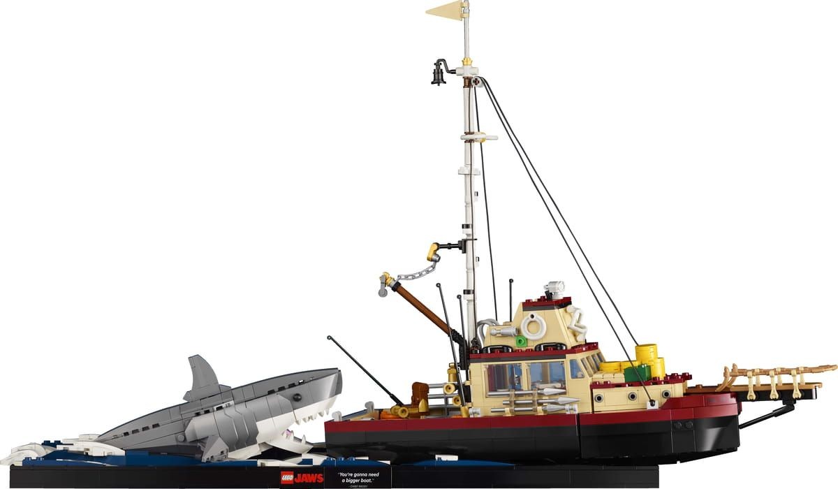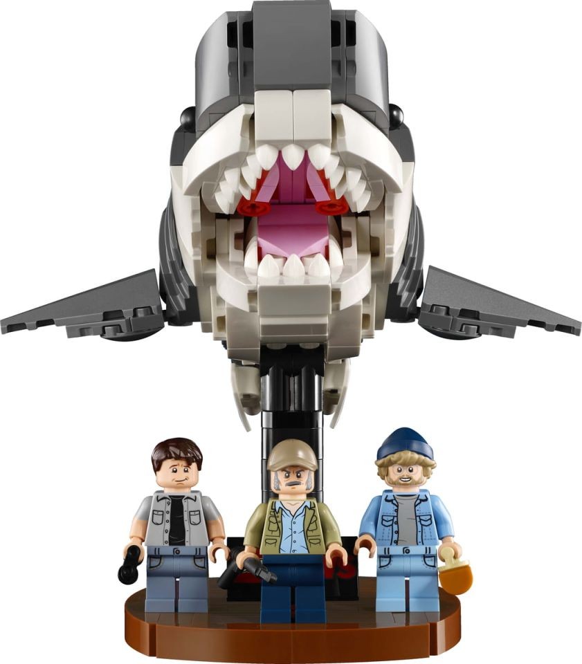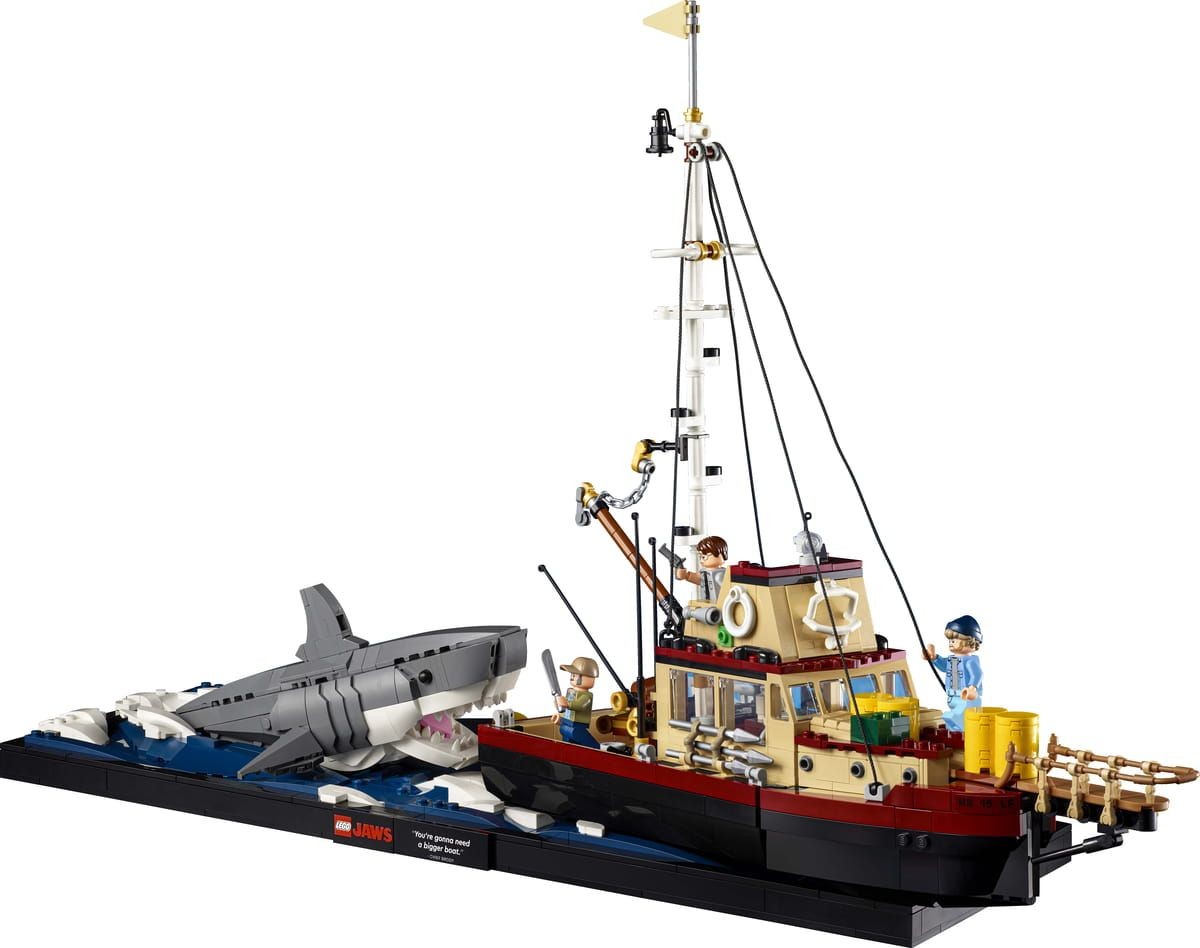 Il set può essere posizionato su una base costruita con mattoncini che raffigura il mare, con il modello dello squalo che attacca la barca Orca. Inoltre, è incluso un mattoncino stampato con la famosa frase del capo della polizia Brody ("Ci serve una barca più grossa") per completare questa riproduzione fedele e dal tocco vintage. In alternativa, lo Squalo può essere esposto separatamente dalla barca, su un supporto apposito.