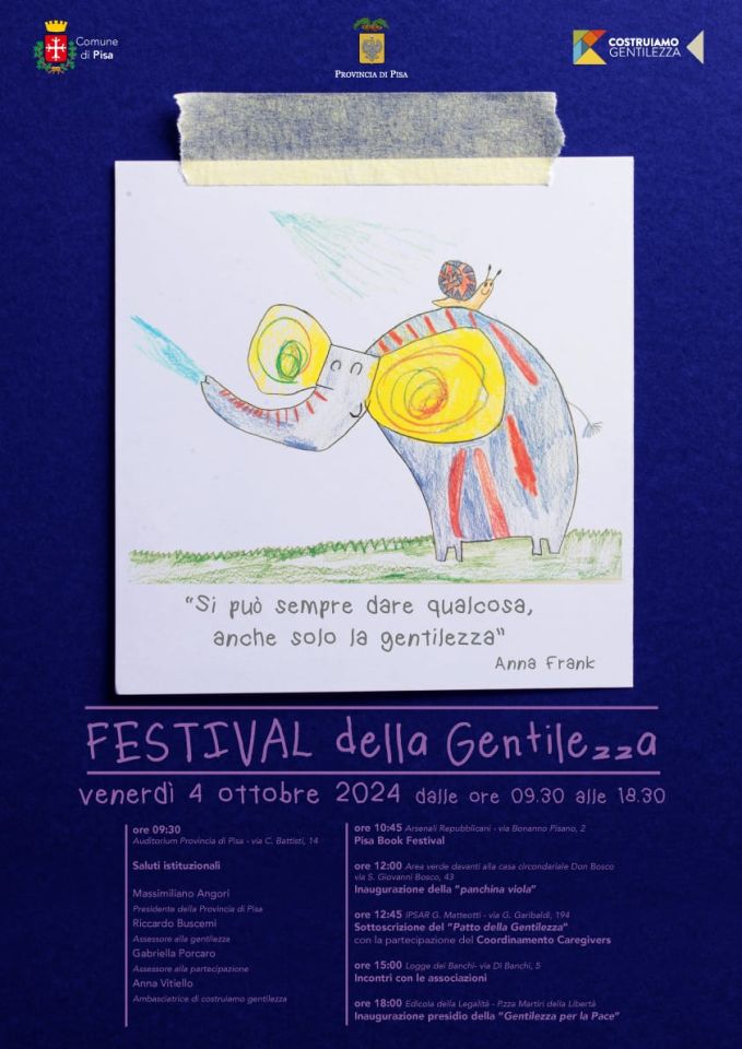 Venerdì 4 ottobre 2024, in occasione della Giornata del Dono, si terrà a Pisa il Festival della Gentilezza: una giornata organizzata dal Comune di Pisa in collaborazione con la Provincia di Pisa, l'Istituto Comprensivo Galilei e l'associazione Costruiamo Gentilezza per diffondere il messaggio del dono e della gentilezza. Il Festival sarà itinerante per coprire i luoghi più significativi della città, con l'obiettivo di diffondere a livello cittadino, con il coinvolgimento di istituzioni, scuole e associazioni, la pratica della cultura dell'accoglienza, della cura e dell'inclusione.